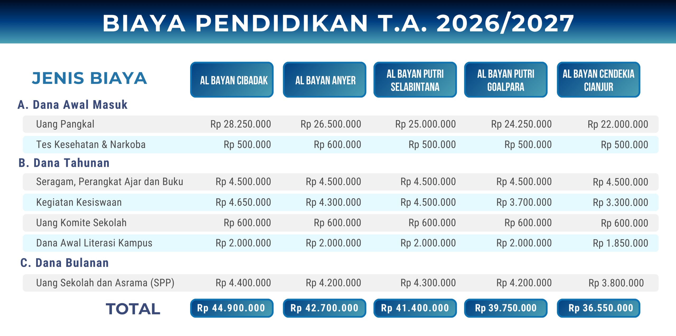 Rp300.000,00 bagi peserta yang ditawarkan diterima di Al Bayan Anyer dan sebelumnya hanya memilih Al Bayan Cibadak. (ditambahkan pada transfer dana awal menjadi sebesar
