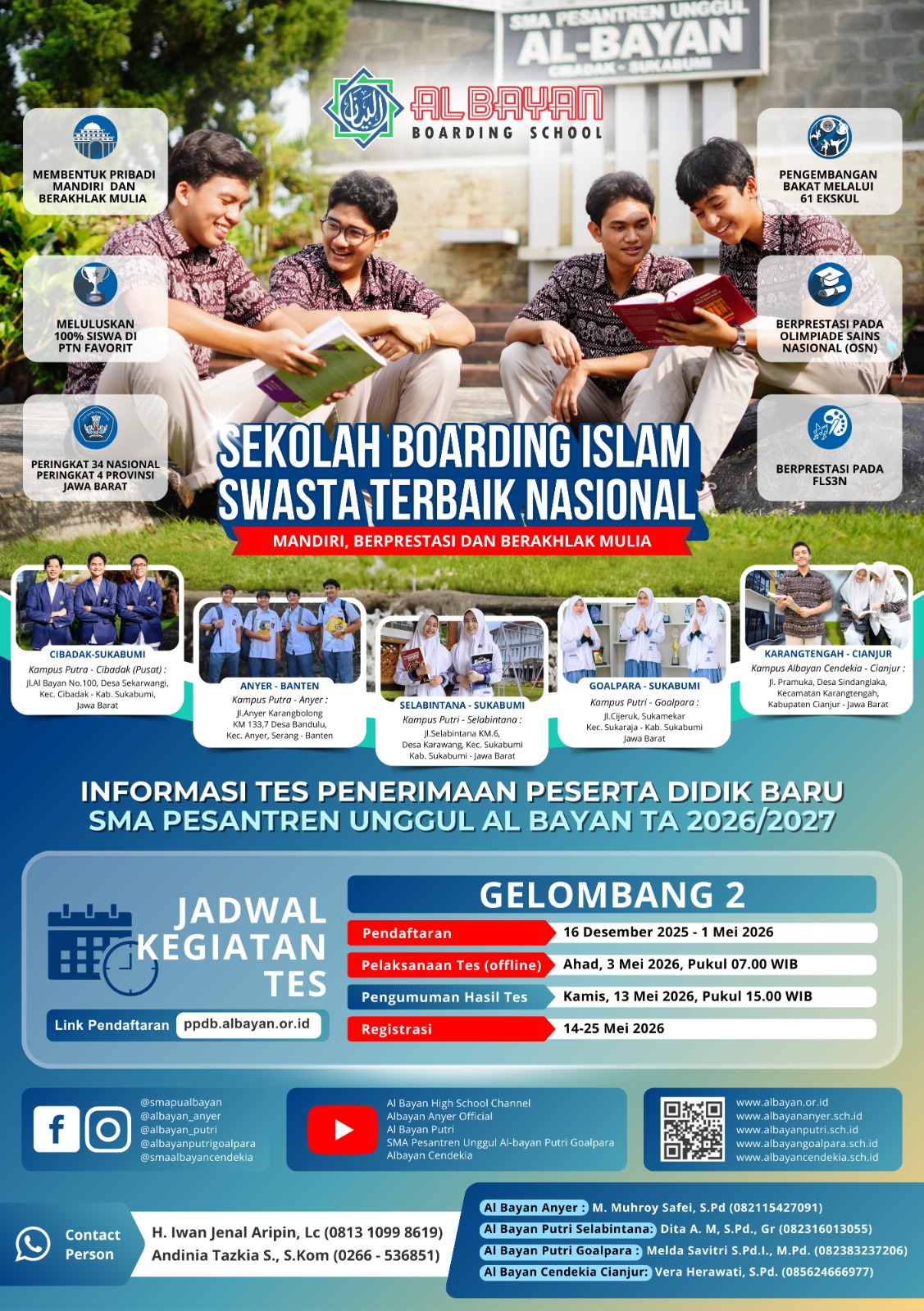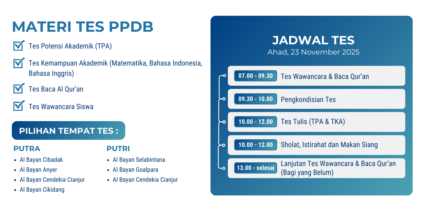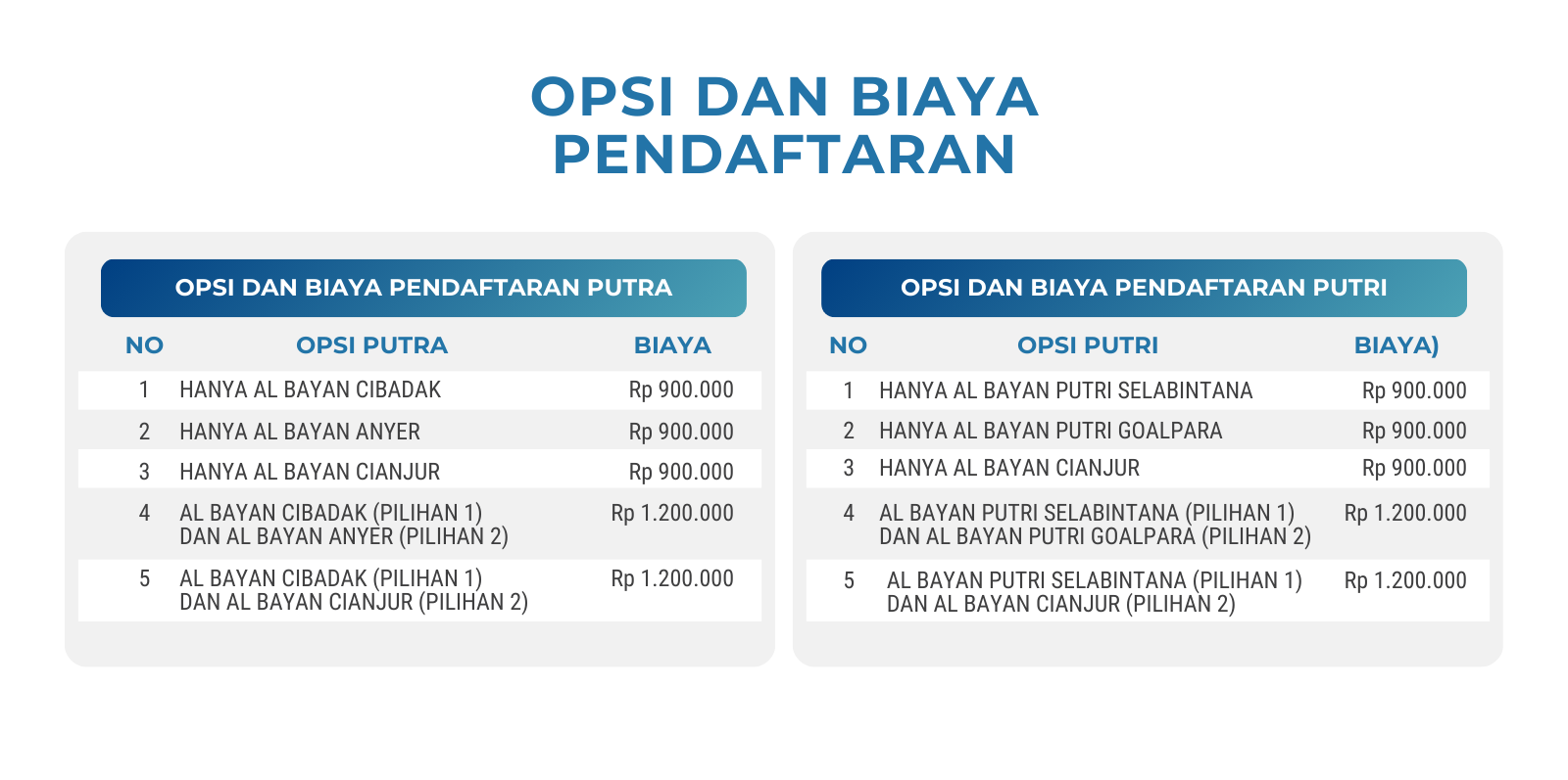 Rp300.000,00 bagi peserta putra yang ditawarkan diterima di Al Bayan Cendekia Cianjur dan sebelumnya hanya memilih Al Bayan Cibadak, dan bagi peserta putri yang ditawarkan diterima di Al Bayan Cendekia Cianjur dan sebelumnya hanya memilih Al Bayan Selabintana (ditambahkan pada transfer dana awal menjadi sebesar
